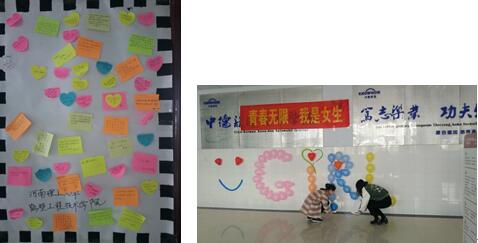 同学们为女生张贴海报,书写美好祝愿。五彩缤纷的便签条像一只只飞舞的美丽蝴蝶,一条条真诚的留言带给女生一声声温暖的祝福。